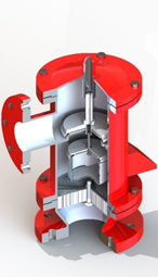 閥盤質(zhì)量根據(jù)油罐的設(shè)計(jì)允許壓力和閥盤直徑確定,必要時(shí)可利用配重調(diào)節(jié)。當(dāng)閥盤自由放在閥座上時(shí),在閥盤重力作用下,氟膜片微微凹向空氣墊凹槽。當(dāng)罐內(nèi)外壓力差增大時(shí),閥盤微微升起,膜片靠自身的彈性,同閥座仍保持良好的密封,直至整個(gè)閥盤跳離閥座,膜片才經(jīng)反彈逐漸恢復(fù)其原狀。